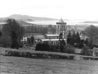 The dented hill in the background is Arnside Knott, further in is Park Hill. To the right of the Church is Fishcarling Head and on the far side of the estuary Foulshore. The white mark across Park Hill had recently been made by excavations for the North Sea Gas Pipe Line.This photograph was taken by the Rev J. C. Hancock in 1984. Please click on the image to enlarge |